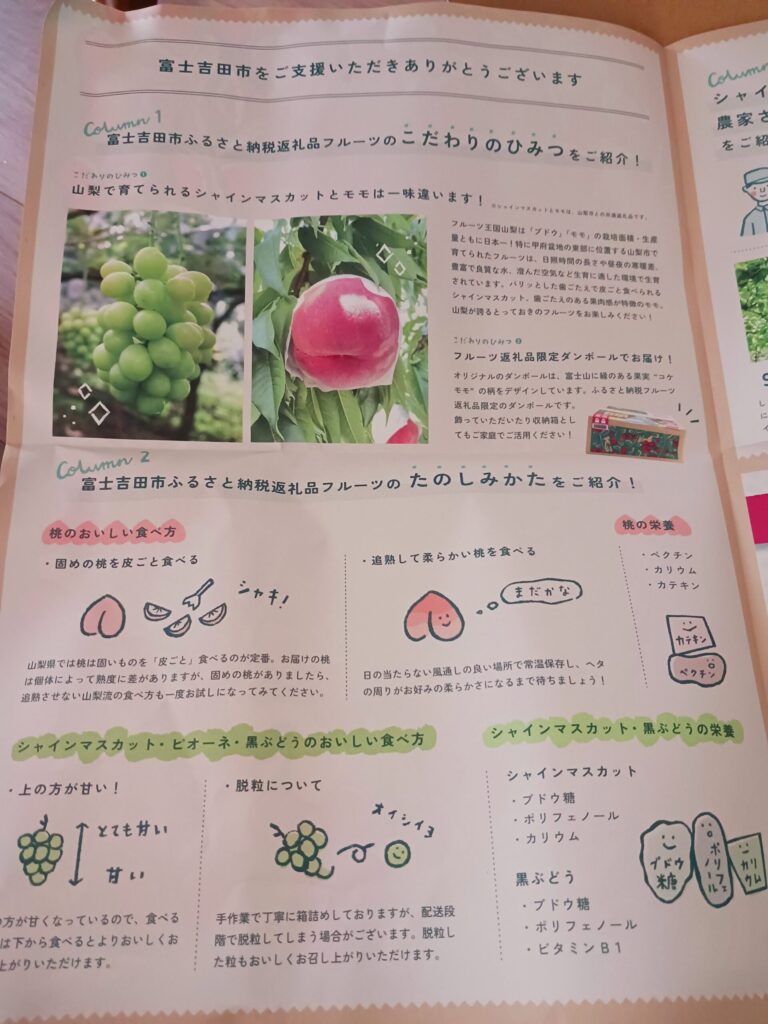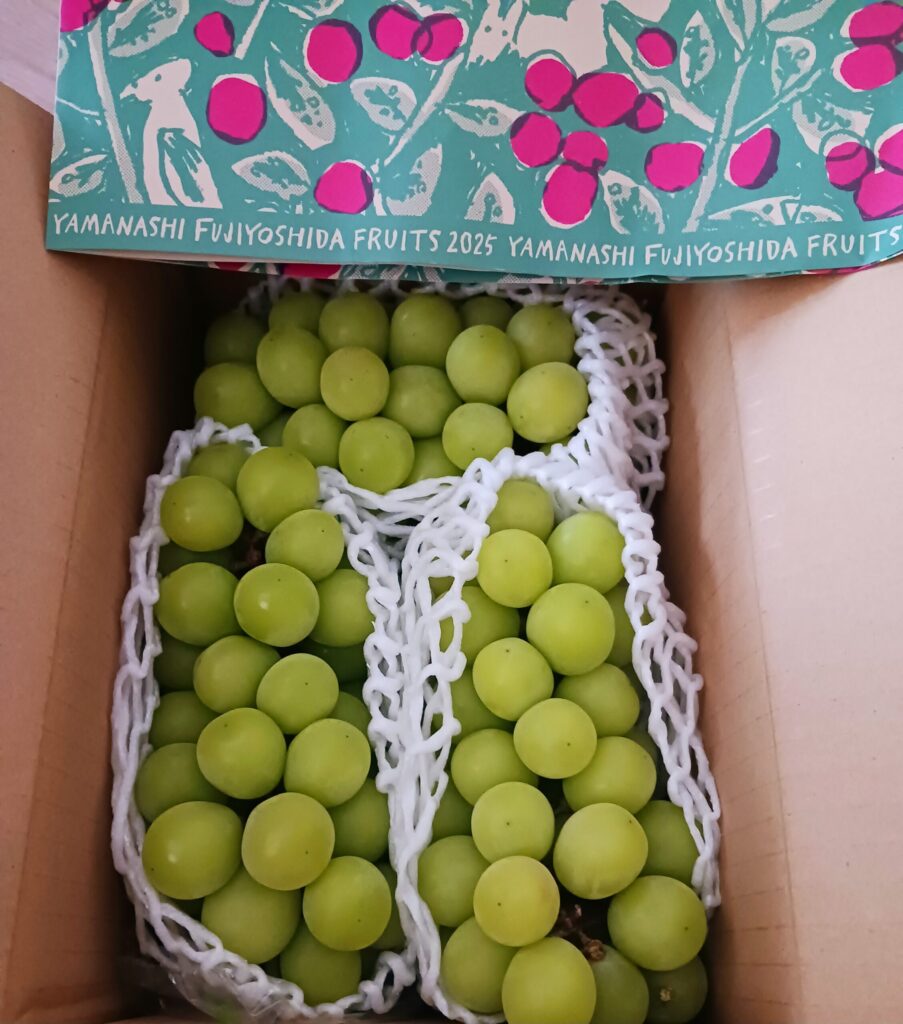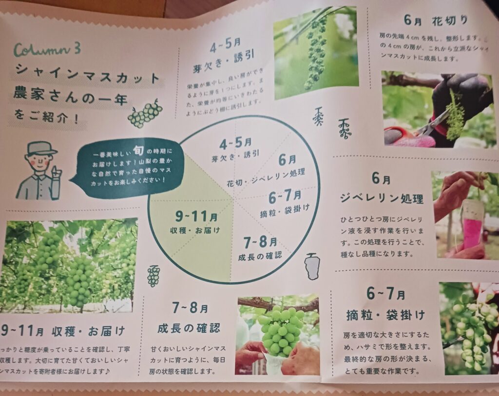 私がいただいたのは、まさにこの吉田フルーツのシャインマスカットのふるさと納税返礼品でした。届いた箱には、ただの段ボールとは思えないほどかわいらしいイラストが描かれていて、その中には農園スタッフの日々の作業風景や、ぶどう栽培への熱い思いが綴られた資料が同封されていました。